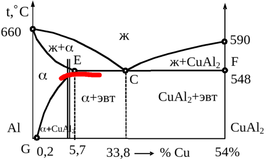 Рис. 10.1. Диаграмма состояния Al - Сu(СuАl2) и интервал закалочных температур