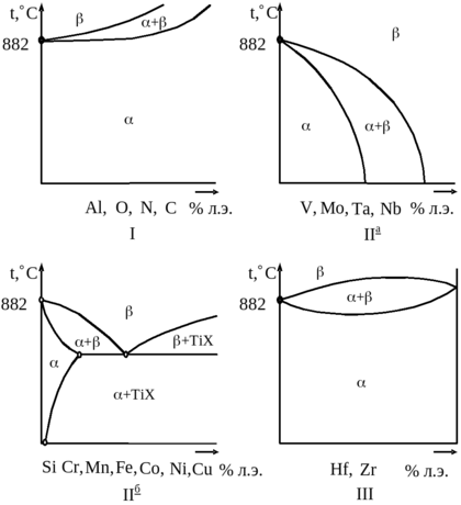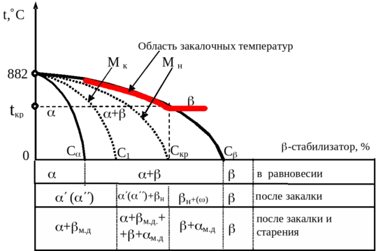 Так как обе эти фазы неразделимы, то в общем случае титановый мартенсит обозначают (). Он образуется при закалке сплавов с концентрацией легирующих элементов до точки С1, так как в этих сплавах при закалке мартенситное превращение протекает полностью.
