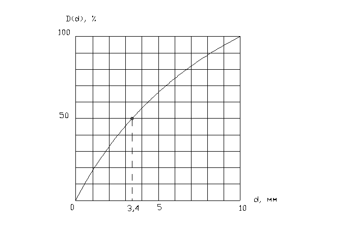 Если окажется, что φ1 где Порядок расчета рассмотрим на примере. 1. На основании заданного гранулометрического состава строим интегральный график распределения частиц по крупности (воспользовавшись предварительно найденной интегральной суммой mi) и находим медианный диаметр (рис. 3) dм = 3,4 мм > 3 мм, т.е. имеем случай перегрузки кускового материала и, следовательно, 2. По формуле (3) определяем площадь неплотностей нижнего укрытия (имея в виду, что L0 =1,5 м; b =0,6 м, при В =0,5 м (см. табл. 1) Fн =2 (1,5 + 0,6) 0,03 = 0,126 м2 3. По формуле (2) определяем расход воздуха, поступающего через неплотности укрытия Существуют другие формулы для определения коэффициента Рис. 3. Интегральный график распределения частиц по крупности 4. По формулам (5)… (7) находим скорости потока частиц в желобе: следовательно n = 4,43 / 5,87 =0,754. 5. По формуле (11) определяем сумму к.м.с. желоба с учетом сопротивления укрытий. При Fв =0,2 м2 по формуле (12) имеем При h/H = 0,12/0,4 = 0,3, по табл. 5 находим ζnep =6,5; 6. По формуле (14) находим объемную концентрацию частиц в желобе 7. По формуле (13) определяем коэффициент лобового сопротивления 8. По формулам (8) и (9) находим соответственно число Бутакова–Нейкова и число Эйлера: 9. Определяем коэффициент «эжекции» в соответствии с формулой (16): И, следовательно, можно пользоваться формулой (17) с учетом (18)… (20): 10. По формуле (4) определяем расход воздуха, поступающего в нижнее укрытие первого перегрузочного узла: С целью сокращения вычислений положим для второго, третьего и четвертого перегрузочных узлов расход Результата вычислений заносим в первую строку табл. 7, полагая, что все перегрузочные узлы оборудованы одним и тем же укрытием, расход воздуха, поступающего через неплотности i – го перегрузочного узла, Qнi = Qн =0,278 м3/с. Результат заносим во вторую строку табл. 7, а сумму расходов Qжi + Qнi – в третью. Сумма расходов Расчет дисперсного состава и концентрации пыли в аспирируемом воздухе Плотность пыли Расход воздуха, поступающего в убытие по желобу – Qжi (через неплотности для укрытия типа «О» – Qнi = QH), удаляемого из укрытия – Qai (см. табл. 7). Геометрические параметры укрытия (см. рис. 1), м: длина – L0; ширина – b; высота – Н. Площадь поперечного сечения, м: а) аспирационного патрубка Fвх= bc.; б) укрытия между наружными стенками (для убытия типа «О») F2=bH; в) укрытия между внутренними стенками (для укрытия типа «Д») F1=b1H; где b – расстояние между наружными стенками, м; b1 – расстояние между внутренними стенками, м; Н – высота укрытия, м; с – длина входного сечения аспирационного патрубка, м. В нашем случае, при В = 500 мм, для укрытия с двойными стенками (укрытие типа «Д») b =0,6 м; b1 =0,4 м; С =0,25 м; H =0,4 м; Fвx =0,25 Удаление аспирационной воронки от желоба: а) для укрытия типа «0» Lу =L; б) для укрытия типа «Д» Lу = L –0,2. В нашем случае Lу =0,6 – 0,2 =0,4 м. Средняя скорость воздуха внутри укрытия, м/с: