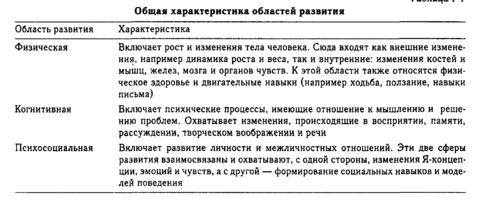 Развитие происходит в трех областях: физической, когнитивной и психосоциальной. К физической области относятся такие физические характеристики, как размеры и форма тела и органов, изменения структуры мозга, сенсорные возможности и моторные (или двигательные) навыки. Когнитивная область (от лат. «cognitio » — «знание», «познание») охватывает все умственные способности и психические процессы, включая даже конкретную организацию мышления. К этой области относятся такие процессы, как восприятие, рассуждение, память, решение задач, речь, суждение и воображение. В психосоциальную область входят свойства личности и социальные навыки. К ней относят присущий каждому из нас индивидуальный стиль поведения и эмоционального реагирования, то есть то, как люди воспринимают социальную действительность и реагируют на нее. Развитие человека в этих трех областях происходит одновременно и взаимосвязанно. В табл. 1 дается характеристика трех основных областей развития.
