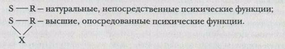 Эта регуляция связана с опосредованным характером ВПФ, причем опосредуются они знаком или стимулом-средством, который создает дополнительную связь между воздействующим стимулом и реакцией человека (как поведенческой, так и мыслительной). Схема психических процессов в представлении Выготского выглядит таким образом: