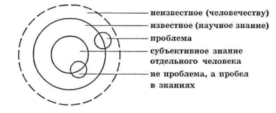 Существуют явления, которые человечеству известны (научные знания). Но есть и явления, о которых человечество еще ничего не знает. Кроме того, есть знания субъективные, т. е. знания отдельного человека. Они могут быть полными (эрудированный человек) и неполными (пробел в знаниях). Научная проблема возникает на стыке известного (научного знания) и неизвестного, а учебная проблема - на стыке субъективного и научного знания.