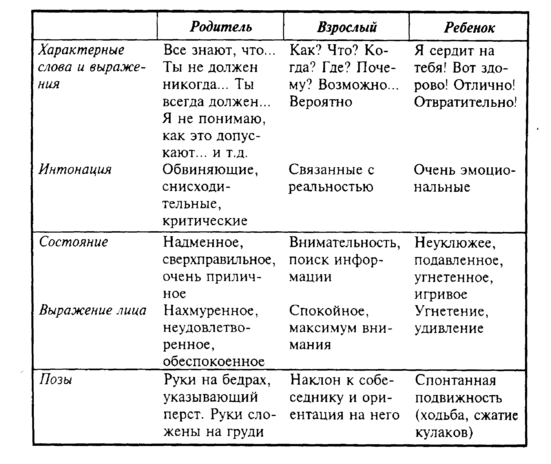 Широко известна и получила наибольшее применение схема, разработанная Э. Берном, в которой основными понятиями являются состоянии Я и трансакции, т.е. единицы общения. Репертуар этих состояний Э. Берн разбил на следующие категории : 1