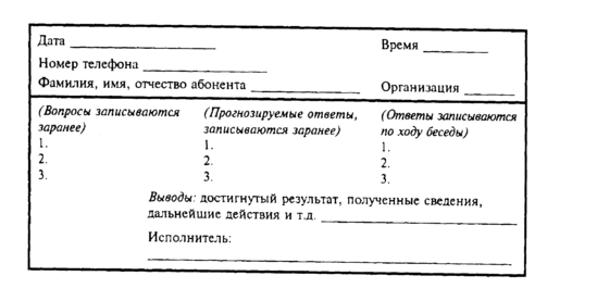 Для подготовки к деловому разговору по телефону, в особенности междугородному и международному, лучше подготовить специальный бланк, в котором будущий разговор записывается с учетом прогнозируемых ответов. Например такой: