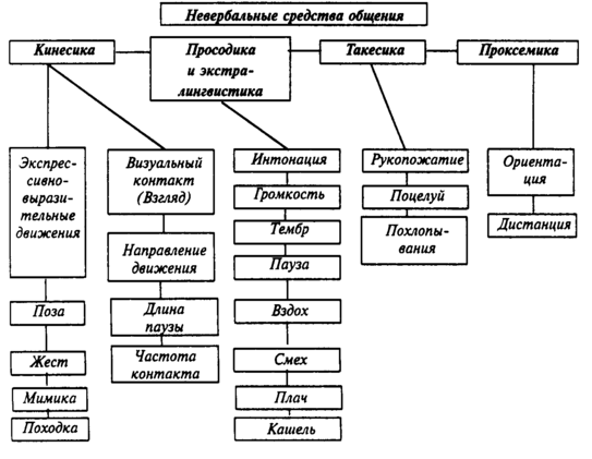 В социально-психологических исследованиях разработаны различные классификации невербальных средств общения, к которым относят все движения тела, интонационные характеристики голоса, тактильное воздействие, пространственную организацию общения 1.