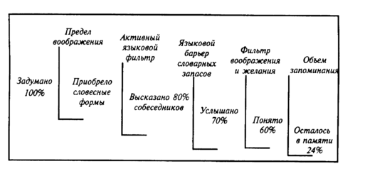 На каждом этапе происходят потери информации и ее искажение. Величина этих потерь определяется и общим несовершенством человеческой речи, невозможностью полно и точно воплотить мысли в словесные формы, о чем образно сказал русский поэт Ф. Тютчев: "Мысль изреченная есть ложь", и наличием или отсутствием доверия к собеседнику, и личными целями и устремлениями (когда желаемое принимается за действительное), и совпадением или несовпадением словарного запаса, и многим, многим другим.