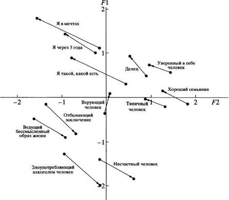 Рис. 1. Семантическое пространство динамики ролевых позиций в ходе гипнотерапии у пациентов наркологической клиники по факторам F1 и F2.