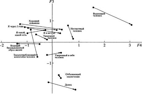 Рис. 2. Семантическое пространство динамики ролевых позиций в ходе гипнотерапии у пациентов наркологической клиники по факторам F3, F4.