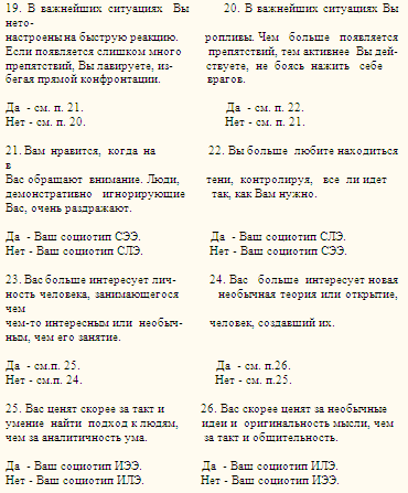 Инструкция: если у Вас больше ответов "Да" с нечетными номерами /13,15,17/, то см. п.19. Если больше четных ответов "Да" /14,16,18/, то см. п.23.