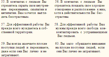 ИНСТРУКЦИЯ: Если у Вас больше положительных ответов с нечетными номерами /55,57,59/, то см.п.61. Если же больше положительных ответов с четными номерами /56,58,60/, то см. п.65.