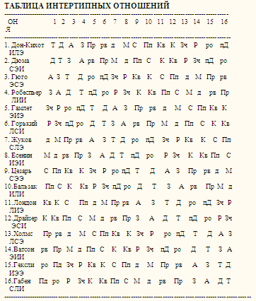 Проведите диагностику психосоциотипов в выбранном вами коллективе. Определите принадлежность членов коллектива к вышеназванным квадрам и интертипные отношения между ними согласно таблице.