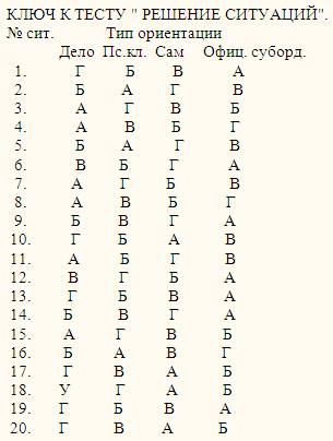 Вначале проверьте правильность ответов, обозначенных Вами в бланке ответов, как направленные на дело. При каждом совпадении с ключом (буквами первого столбца) поставьте себе +5 баллов. При каждом несовпадении - -5. Подсчитайте общую сумму, которая может колебаться от +100 до -100 баллов. Ответ "0" считается неплохим для начинающего управленца. Хороший же руководитель должен уметь четко дифференцировать сферу направленности своих управленческих усилий: на дело, на психологический климат, на собственные интересы , на официальную субординацию. Успешный руководитель в своей работе ориентируется в равной степени на интересы дела и интересы людей, которые под его руководством делают это дело ( психологический климат ). Теперь подсчитайте свою личную направленность. За каждое совпадение с определенным столбцом ключа поставьте себе 1 балл соответственно направленности: дело, психологический климат, сам ( личные интересы ), официальная субординация.