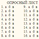 ИНСТРУКЦИЯ РЕСПОНДЕНТУ: опросник содержит 16 групп утверждений, характеризующих деловые качества руководителя. Каждая группа состоит из трех утверждений, обозначенных буквами а, б, в. Вам следует внимательно прочесть все три утверждения в составе каждой группы и выбрать одно, которое в наибольшей степени соответствует Вашему мнению о руководителе (или о себе самом как руководителе, если Вы оцениваете свою управленческую деятельность). Отметьте выбранное утверждение на опросном листе знаком "+" под соответствующей буквой.