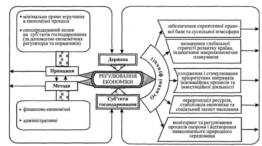Основними принципами державного регулювання економіки заведено вважати: по-перше, мінімальне втручання державних органів у економічні процеси (виконання ними лише тих функцій, які не можуть виконувати самі суб'єкти ринкових відносин); по-друге, вплив відповідних владних структур на розвиток соціально-економічних процесів за допомогою встановлюваних державою економічних регуляторів і нормативів.