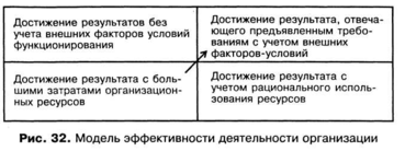 Данное определение отражает и «внутреннюю», и «внешнюю» стороны эффективности организаций, а именно рациональное использование организационных ресурсов и достижение результата с учетом внешних факторов — условий функционирования организаций.