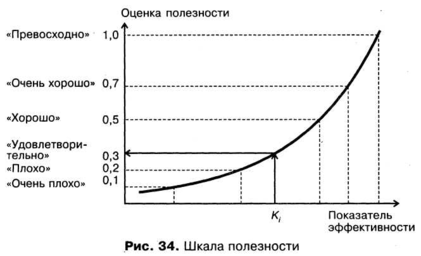 Показатель, имеющий наибольший вес, получает ранг 1. Для каждого наиболее важного критерия разрабатывается шкала полезности с интервалом 0—1,0. Основным назначением шкалы является преобразование разнородных измерителей в эквивалентные им баллы. Пример построения такой шкалы показан на рис. 34. В нашем случае 0 означает самый низкий уровень результативности для данного критерия; 0,1 — очень плохой уровень; 0,2 — плохой уровень; 0,3 — удовлетворительный уровень; 0,5 — хороший уровень; 0,7 — очень хороший уровень и 1,0 — самую высокую результативность.