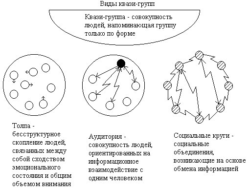 Помимо социальных групп социологи выделяют квазигруппы ("как бы" группы) — неустойчивые социальные образования, возникающие спонтанно. Они могут превратиться в группы, если в ходе взаимодействия между участниками будут устанавливаться отношения солидарности и контроля. К квазигруппам относят аудитории — сложные, неоднородные социальные образования с односторонним воздействием (оратор слушатели) со слабой обратной связью. Квазигруппой является толпа — временное собрание людей, объединенных в физически ограниченном пространстве общностью интересов. Толпа характеризуется следующими признаками: внушаемость, спонтанность поведения, основанная на эмоциях, анонимность и неуязвимость (в толпе отдельные ее члены чувствуют себя неузнаваемыми и неподконтрольными). Толпы можно разделить на несколько видов: