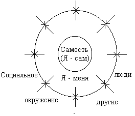 «Я-Сам»(по Миду – I) — это реакция личности на воздействия других людей и общества в целом, иначе говоря, - субъект - наблюдатель. «Я-Меня»(по Миду – Me) — осознание человеком себя с точки зрения других значимых для него людей — родственников, друзей. «Я-Меня» - объект - наблюдаемый. Например, я – «Я-Сам» воспитан в принципах бережного отношения к деньгам («копейка рубль бережет»), но окружающие меня люди считают скупость пороком, и я в отношениях с ними («Я-Меня») стараюсь быть щедрым и великодушным .
