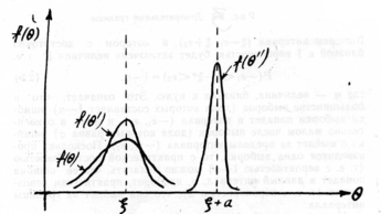 На рис. 1.9.2 показаны кривые распределения трех статистик. Из них θ и θ' — несмещенные и потому для построения оценки предпочтение должно быть отдано статистике θ' с меньшей дисперсией. Статистика θ" обладает еще меньшей дисперсией, однако она менее пригодна в качестве оценки, так как ее центр рассеяния смещен относительно параметра ξ`.
