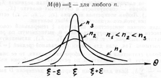 1) Свойство состоятельности означает, что распределение статистики θ с ростом объема выборки п концентрируется в сколь угодно малое окрестности параметра ξ (статистика θ стремится по вероятности к оцениваемому параметру ξ). Свойство состоятельности выражается предельным равенством: для любого столь угодно малого положительного числа ε
