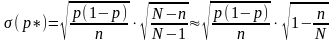 В случае безвозвратной выборки случайная величина р*, как доказывается в теории вероятностей, имеет так называемое гипергеометрическое распределение. Ее математическое ожидание, как и в случае возвратной выборки, равно генеральной доле: М(р*)=р, а среднее квадратическое отклонение вычисляется но формуле: