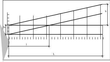 Вибромарка вычерчивается на бумаге в виде острого угла с основанием b=5...20 мм и L=50...200 мм и наклеивается на поверхность конструкции, размах колебаний которой требуется определить. Колебания совершаются в направлении стрелок (Рис. 10). Наблюдатель может измерить расстояние l до пересечения сдвоенных треугольников, а затем определить амплитуду колебаний по формуле