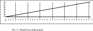 Вибромарка инженера Р.И. Аронова (рис. 7) служит для измерения вибрации с постоянной амплитудой. Принцип действия прибора основан на оптическом эффекте человеческого глаза, т. е. на слитности восприятий явлений, чередующихся быстрее 7 раз в 1 секунду. Следовательно, вибромарка применима при колебаниях с частотой 17 циклов в секунду с малой амплитудой или 8 циклов в секунду при большей амплитуде, так как при меньшем числе колебаний наблюдатель не может надёжно видеть фигуру возникающего клина. Чем больше амплитуда вибрации, тем ближе к основанию расположится остриё клина (рис. 9). Таким образом, вибромарка может быть протарирована как приспособление для измерения амплитуд.