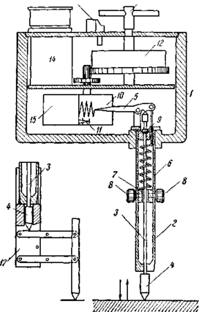 Виброграф (рис. 11) состоит из корпуса 1, в который запрессована трубка 2. Внутри трубки расположен стержень 3 с выступающим наружу наконечником 4. Верхний конец стержня проходит в корпус и упирается своим наконечником в рычаг 5, оттягиваемый книзу концом спиральной пружины 6, прикрепленной к поводку 7. Поводок может передвигаться вдоль трубки и закрепляться в желаемом положении двумя винтами 8. Передвигая поводок книзу, можно увеличить давление пружины на стержень. Чтобы давление пружины не вытолкнуло стержень вниз, в верхней его части, под наконечником насажена сферическая шайбочка 9, упирающаяся в соответствующее гнездо.