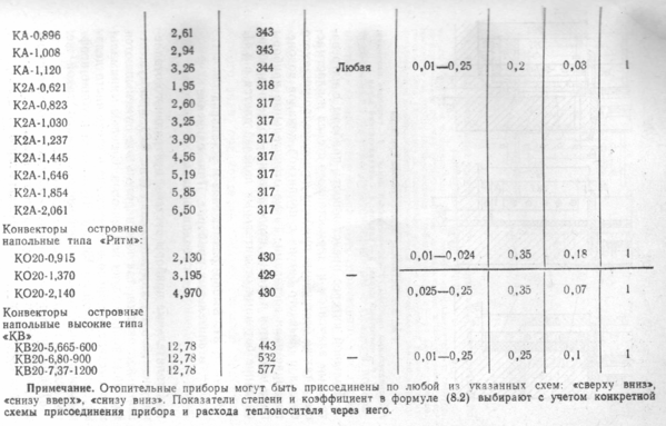 | Наименование прибора, его тип, марка | Площадь поверхности нагрева секции f:, м2 | Номинальная плотность теплового потока ?ном, Бт/мг | Схема присоединения прибора | Расход тетлоно-сителя через прибор Gnp, кг/с | Показател! В п | i степени и коэффициент формуле (8.2) г \ спр | ||