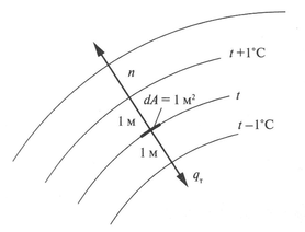 где qT - поверхностная плотность теплового потока, проходящего через плоскость, перпендикулярную тепловому потоку, Вт/м2;