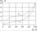 Для подавляющего числа строительных материалов изотермы сорбции и десорбции не совпадают. Разность весовых влажностей строительного материала при одной и той же относительной влажности воздуха φ называется сорбционным гистерезисом. На рис.8 представлены изотермы сорбции и десорбции водяного пара для пеносиликата. по [38]. Из рис.8 видно, что, например, для φ = 40% при сорбции пеносиликат имеет весовую влажность ωв=1,75%, а при десорбции ωв=4%, следовательно, сорбционный гистерезис равен 4-1,75=3,25%.