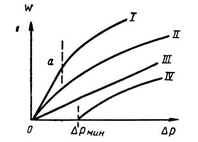 Прямолинейный участок от 0 до точки а на кривой 1 свидетельствует о ламинарном движении воздуха по порам материала с равномерной пористостью при малых значениях разности давлений. Выше этой точки на криволинейном участке происходит турбулентное движение. В материалах с разными размерами пор движение воздуха турбулентно даже при малой разности давлений, что видно из кривизны линии 2. В маловоздухороницаемых материалах, напротив, движение воздуха по порам ламинарно и при довольно больших разностях давлений, поэтому зависимость G от ΔР линейна при любой разности давлений (линия 3). Во влажных материалах (кривая 4) при малых ΔР, меньших определенной минимальной разности давлений ΔРмин, воздухопроницаемость отсутствует, и лишь при превышении этой величины, когда разность давлений окажется достаточной для преодоления сил поверхностного натяжения воды, содержащейся в порах материала, возникает движение воздуха. Чем выше влажность материала, тем больше величина ΔРмин.