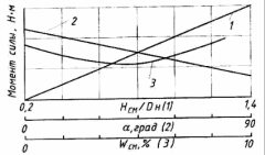 Мал.5.5. Залежність моменту сили на валах від висоти суміші в лотку (1), кута нахилу лопатей (2) і вогкості оброблюваної суміші (3).