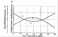 Мал.5.4. Залежність продуктивності (1) і коефіцієнта неоднорідності змішування (2) від кута нахилу лопатей на валу.