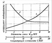 Рис 5.2. Залежність коефіцієнта неоднорідності змішування від вогкості (1) суміші і концентрації компоненту (2)