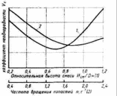 З технологічних чинників, що впливають на ефективність змішування, слід назвати кількість (об'їм) сировинної суміші, обробці, що піддається. В одновальних і двохвальних змішувачах безперервної дії кількість суміші можна характеризувати заввишки суміші в лотку (кориті). Із збільшенням висоти суміші коефіцієнт неоднорідності змішування спочатку знижується, досягає мінімально можливої величини, а потім знову починає рости (мал.5.3). У одновального змішувача це зростання виявляється менш, а у двохвального - більш істотно. Оптимально можливі значення коефіцієнта неоднорідності змішування силікатної формувальної маси у цих змішувачів різні [54,79].