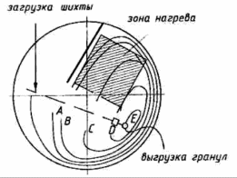 Мал.10.3. Схема грануляції на тарілці з локальним нагрівом: А - зона підготовки до зародкоутворення; В - зона зародкоутворення; З - зона зростання гранул; D - зона обливання гранул; Е - зона вивантаження.