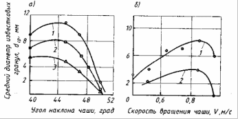 Простіше регулювати розмір гранул, змінюючи швидкість їх скачування. З її збільшенням розмір гранул спочатку росте, а потім, коли вона перевищить допустиму для даного розміру гранул, відбувається їх подрібнення. У свою чергу, швидкість скачування на тарілчатому грануляторі зростає із зростанням частоти обертання і кута нахилу (мал.10.4). Кожному куту нахилу відповідає певний критичний розмір гранул, вище за яке вони існувати не можуть і розбиваються.