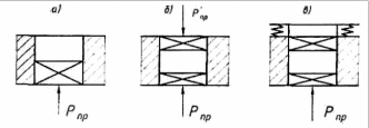 Мал.6.7. Схеми статичного пресування: а - одностороннє; б - двостороннє; в - одностороннє з "плаваючою" прес-формою.