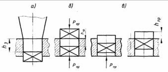 Для витягання з прес-форм спресованих напівфабрикатів (пресувань) вимагається докласти з боку механізму випресовки (виштовхування) зусилля, яке залежить від великої кількості чинників: фізико-механічних і технологічних властивостей формувальної суміші (прес-пороша); способу і величини тиску пресування; характеристики пресування; напрями і закономірності випресовки; форми, розмірів і порожнистості пресування; конструкції, жорсткості і якості прес-форм; коефіцієнта тертя між пресуванням і стінками прес-форми і ін. (мал.6.16).