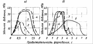 На мал.6.14 приведені діаграми (циклограми) пресування силікатних формувальних сумішей на вітчизняних і зарубіжних пресах.