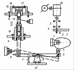 Мал.6.17. Установка для вивчення процесу випресовки (виштовхування): а - схема установки; б - кінематична схема приводу; 1 - рама; 2 - приводний вал; 3 - кулачок; 4 - ролик; 5 - виштовхуючий важіль; 6 - опора; 7 - пружина; 8 - фіксатор; 9 - поршень; 10 - циліндр; 11 - ходовий гвинт; 12 - контргайка; 13 - штамп; 14 - прес-форма; 15 - скоба; 16 - гвинт; 17 - пресування (нап