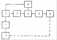 Мал.6.15. Блок-схема контролю зусилля пресування: 1 - прес; 2 - електродвигун механізму пресування; 3 - трансформатор струму; 4 - перетворювач потужності; 5 - підсилювач сигналів; 6-осцилограф; 7 - пульт управління; 8 - тарировочний блок.