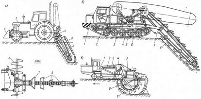 По типу рабочего органа цепные экскаваторы делятся на одноцепные, снабженные резцами и скребками, и двухцепные, между ветвями которых укреплены ковши или скребки с резцами. Скребковые одноцепные экскаваторы (рис. 4.9, а) предназначены для отрывки траншей прямоугольного профиля шириной 0,14...0,4 м, глубиной до 1,7 м в однородных (без каменистых включений) грунтах I — III групп. Производительность таких экскаваторов составляет 60...80 м3/ч. Скребковые двухцепные экскаваторы (рис. 4.9, б) используют для рытья траншей прямоугольного и трапецеидального сечений глубиной до 3,5 м, шириной по дну до 1,1 м и поверху до 2,8 м в талых грунтах I — III групп с включением камней диаметром до 0,2 м и в мерзлых грунтах с глубиной промерзания до 1,2 м. Разработка грунта ведется режущими элементами скребкового типа и транспортирующими заслонками. Для отрывки траншей трапецеидального профиля на рабочем органе экскаватора устанавливают активные цепные откосообразователи. Грунт, отделяемый цепями от целика, обрушивается на дно траншеи, откуда выносится на поверхность транспортирующими заслонками. Для разработки мерзлых грунтов устанавливается сменное рабочее оборудование — ковшовая цепь с зубьями-клыками. Поднятый наверх скребками (ковшами) грунт выгружается на поперечный ленточный конвейер и отводится им в сторону от траншеи (до 3 м). Производительность двухцепных экскаваторов до 220 м3/ч. Роторные траншейные экскаваторы (рис. 4.9, в) разрабатывают траншеи различного сечения в грунтах I — IV групп с включением камней диаметром до 0,3 м, а также в мерзлых грунтах при глубине промерзания до 1,5 м. Ширина траншей поверху до 3,2 м, понизу до 2,1 м, глубина до 2,5 м. Во время поступательного движения трактора и вращательного движения ротора ковши с зубьями непрерывно разрабатывают, поднимают на поверхность и выгружают грунт на ленту поперечного конвейера. Размеры траншей определяются шириной ковшей и степенью заглубления в грунт ротора. Для образования откосов с крутизной до 1 : 0,25 в талых грунтах экскаваторы оборудуются пассивными ножевыми откосниками, в мерзлых грунтах — активными фрезерными уширителями. Производительность роторных экскаваторов до 1200 м3/ч. Экскаваторы-каналокопатели работают по тому же принципу, что и роторные. В отличие от роторных они способны отрывать каналы с пологими откосами (до 1 : 1,5) при ширине понизу до 2,5 м, глубине до 3 м. До установки экскаватора непрерывного действия на трассу необходимо выполнить планировочные работы. Ширина спланированной полосы должна быть не меньше ширины гусеничного хода экскаватора, предназначенного для рытья траншеи. После планировочных работ и разбивки оси траншеи рытье траншеи, как правило, начинают со стороны низких отметок продольного профиля (для удобства водоотлива) и ведут навстречу уклону, при этом отвалы грунта, вынутого из траншеи, следует размещать с одной стороны выемки (преимущественно с нагорной) для защиты вырытой траншеи от стока поверхностных вод и возможности выполнения последующих монтажных работ с другой стороны.
