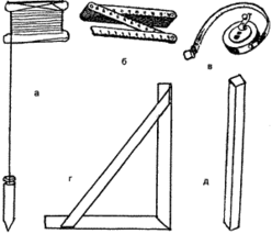 Рис. 32. Контрольно-измерительные инструменты для каменной кладки: а - отвес; б - складной метр; в - рулетка; г - угольник; д - деревянное правило
