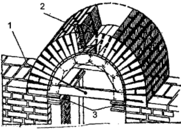 Рис. 35. Шаблон для кладки арок, сводов: 1 - шнур; 2 - шаблон-угольник; 3 – клинья.