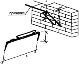 Каменная кладка — дело не простое, поэтому чтобы сохранить постоянную толщину, правильность кладки по рядам, выдержать точное направление требуется ряд приспособлений: шнур-причалка, порядовка и многое другое. Порядовка — это обычная рейка длиной 3 м (рис. 33, в). На порядовке стоят метки через каждые 77 см (почему именно 77-см — сюда входит высота кирпичного ряда 65 мм и толщина горизонтального шва раствора 12 мм). Кроме деревянных реек-порядовок, применяются и металлические порядовки. Причалка натягивается между порядовками и отстоит от стены с учетом подкладки под нее кирпича (рис. 34, а). Причалка выполняется из крученого шнура толщиной 3 мм и назначение ее обеспечить прямолинейность рядов кладки. Иногда возникает необходимость разборки каменных стен, пробивки борозд под требуемые коммуникации. Для этих целей используют пневматические отбойные молотки, скарпели, шлямбуры, пробойники с наконечниками из твердых металлов (рис. 31, е, ж, з).