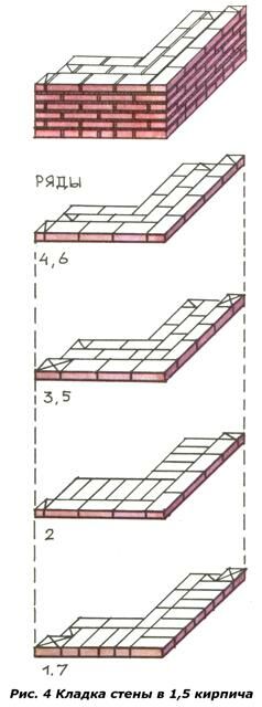 На (рис.4) показаны порядовки кладки толщиной в 1,5 кирпича простенков, углов, а также устройство четвертей проемов при многорядной системе перевязки. По краям оконных и дверных проемов для установки коробок закладывают с каждой стороны по две деревянные пробки размером в полкирпича. Их нужно обернуть одним слоем рубероида. Коробки перед установкой в проем также изолируют рубероидом. Разрез готовой кирпичной стены показан на (рис.5). Однако стены сплошной кладки из полнотелого кирпича толщиной более 38 см (то есть в 1,5 кирпича) экономически невыгодны. Во-первых, из-за того, что получается слишком большой расход строительных материалов, а во-вторых, тяжелые стены требуют соответственно и массивных фундаментов, что еще более увеличивает расход кирпича, цемента и т. д. Что в таком случае надо делать? Есть два варианта.