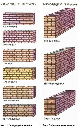Самый распространенный кирпич — это обыкновенный глиняный красный. Годится и белый силикатный. Правда, его нельзя применять для кладки фундаментов, печей и каминов. Для облицовки стен используют лицевой (желтый) кирпич. Все кирпичи выпускаются либо полнотелыми, либо пустотелыми (эффективными), то есть с круглыми или прямоугольными сквозными отверстиями. Кстати, такие кирпичи обладают лучшими теплотехническими показателями. 250x120x65 мм или 250x120x88 мм. Широкие его грани называются соответственно верхней и нижней постелью, длинная боковая грань — ложком, короткая — тычком. Ряд кирпичей, уложенных длинной стороной вдоль стены, называется ложковым, а поперек стены — тычковым. Наружные ряды кладки называются верстой, внутренние (скрытые) — забуткой. На забутку используют кирпичи со сколами и далее бой (половняк). В магазине вам могут предложить и керамический камень. Это, по сути, тот же кирпич, но большего размера — 250x120x138 мм. Его выпускают только пустотелым. Прочность стены достигается перевязкой швов кладки — однорядной или многорядной. При однорядной системе, как правило, последовательно чередуются ложковые и тычковые ряды кладки либо комбинации из них (рис.1). Правда, такой способ требует более высокой квалификации каменщика, и к тому же на углы дома нужно заготовить много трехчетвертных кирпичей. Многорядная перевязка значительно проще. Здесь на один тычковый ряд приходится три-пять ложковых (рис.2), класть которые легче и быстрее. К тому же рисунок швов выглядит как дополнительный элемент украшения. Декоративность можно еще более усилить, если кладку лицевых поверхностей стен делать по трех-пятирядной системе и со сквозными вертикальными швами (рис.3). Тогда на наружную версту лучше брать лицевой (желтый) или отборный красный кирпич. Если для ложковых и тычковых рядов использовать кирпичи разного цвета, получится полосатая стена. Впрочем, об узорах мы поговорим позже. А сейчас вернемся к технологии строительных работ.
