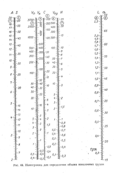 Масса навалочных грузов. Для определения массы навалочных грузов в процессе приема-сдачи груза портом заранее измеряют вместимость грейферов и ковшей. В присутствии представителей порта (работников склада и отдела механизации) и клиентуры обмеряют грузозахватные приспособления, устанавливают массу грузов с различными показателями транспортной характеристики, нумеруют контрольные грейферы и составляют сводный паспорт, где фиксируется масса различных грузов для контрольного грейфера. Массу партии груза получают умножением массы контрольного грейфера на количество перегруженных грейферов. Массу навалочных грузов можно определять с помощью бункерных или транспортерных весов. В ряде портов учет количества груза производится с помощью крановых весов. При определении массы груза в штабеле на причале следует учитывать, что штабель может быть правильной геометрической формы (конус, пирамида, призма, клин, обелиск). Это позволяет использовать для определения объема штабелей навалочных грузов известные из геометрии формулы расчета объемов отдельных геометрических фигур. Масса груза в штабеле определяется по формуле Q = Vн где VH - объем штабеля, м3; - плотность груза, т/м3. Номограмма состоит из девяти логарифмических шкал, расположенных на пяти осях. Шкалы 1, 2, 3, 4, 5, 7, 9 имеют одну разрешающую прямую. Линия, проведенная через две точки на любых двух осях, дает возможность определить все остальные элементы. Шкалы 5, 6, 8 связаны также одной разрешающей прямой и предназначены для определения объема призмы.